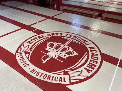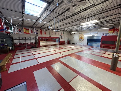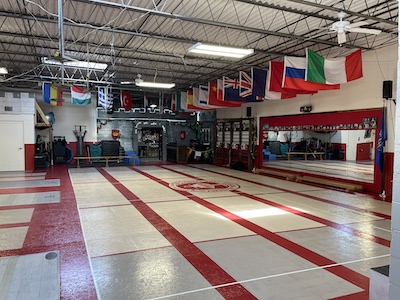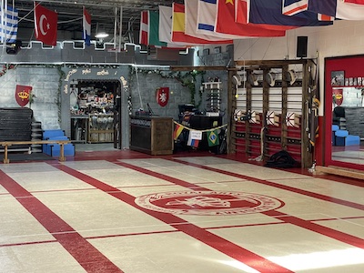 Royal Arts is conveniently located in Gahanna. It's more than just a place to train. For most of our fencers it is a home away from home. As they say a man's home is his castle, and we took that literally, including the drawbridge out back! Our facility has twelve strips, one being a finals stage. We have a very large armory and work space, an office to relax in while waiting on the fencers, free WIFI, coffee, tea and lockers available. We have a permanent projection and audio system for our overnight lock-ins and video analysis for our athletes. There's much more, but you really need to come see it. Below are just a few photos of our venue.